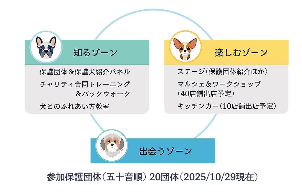 保護犬譲渡会、マルシェ、キッチンカー、保護犬紹介ステージ、フォトブース、パックウォーク など