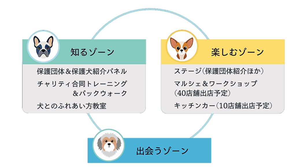 保護犬譲渡会、マルシェ、キッチンカー、保護犬紹介ステージ、フォトブース、パックウォーク など