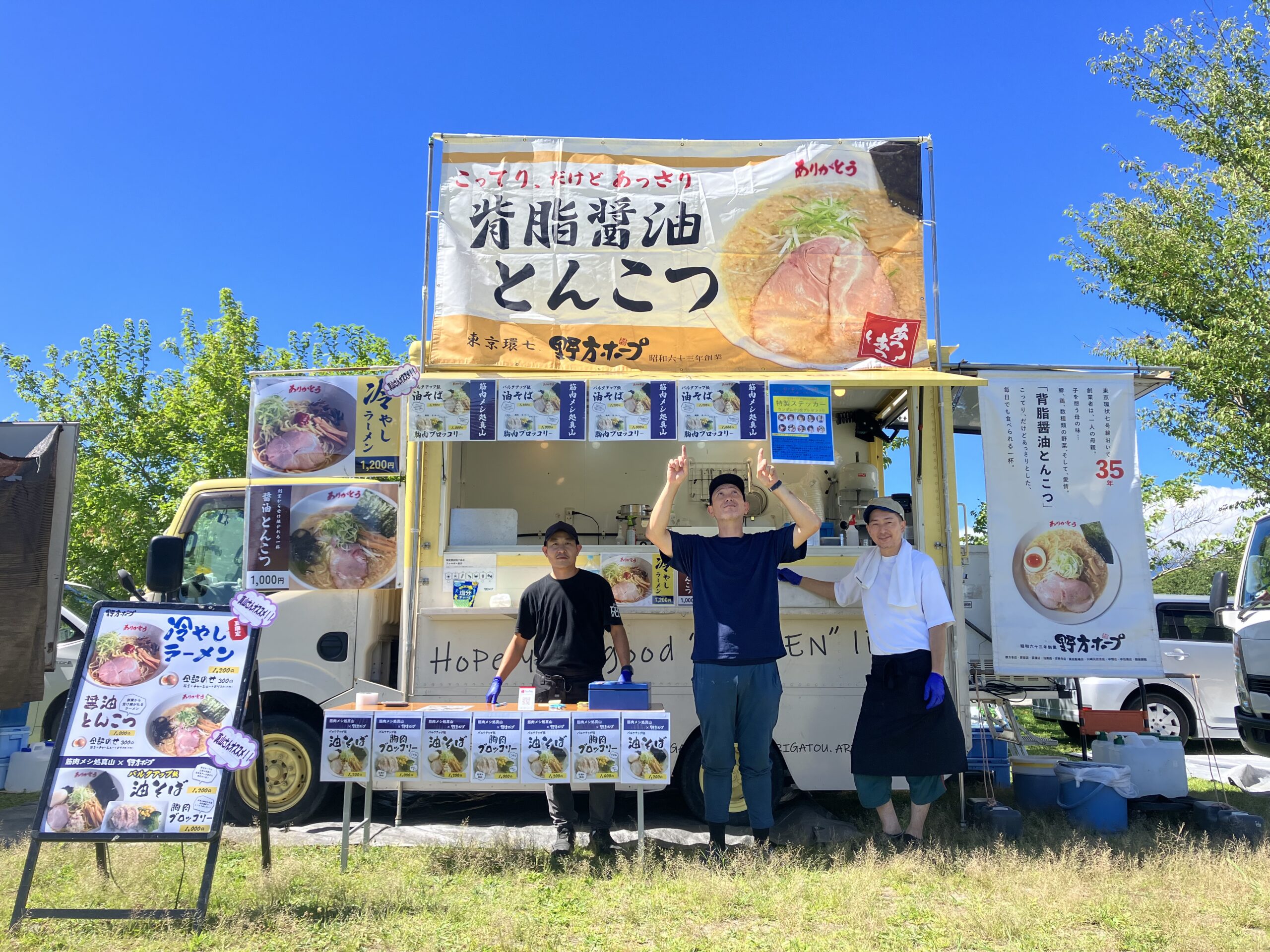 野方ホープ キッチンカー 2026.02.28 野方ホープ 「背脂醤油とんこつラーメン」は、豚骨、鶏ガラ、野菜のトリプルスープに、甘味の多い背脂を加えこってり、だけどあっさり食べられる、寒い日にもってこいの一杯に仕上げました。 MENU背脂醤油とんこつラーメン¥1000背脂醤油とんこつラーメン全部のせ¥1300あぶらそば¥1000あぶらそば全部のせ¥1300缶ビール¥600