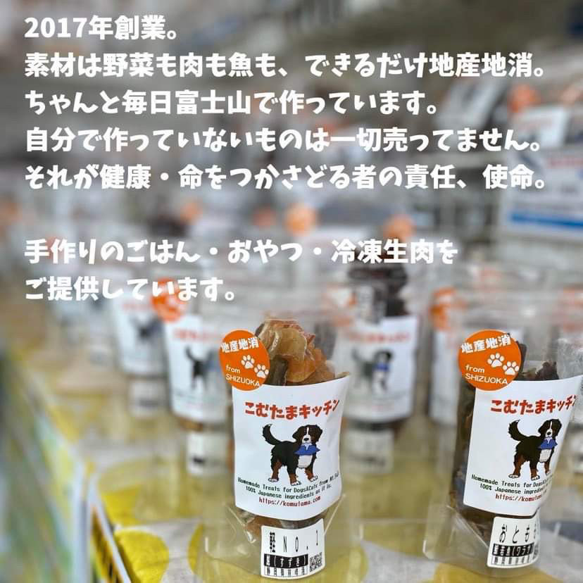 こむたまキッチン マルシェ 2026.01.28 こむたまキッチン 食材・旬・手作り・無添加にこだわった犬猫ごはん&おやつです。 地産地消をモットーに富士山の山の中で日々作ってます。保護犬をお迎えする方には「パピプレ」という企画を常に行なっています。