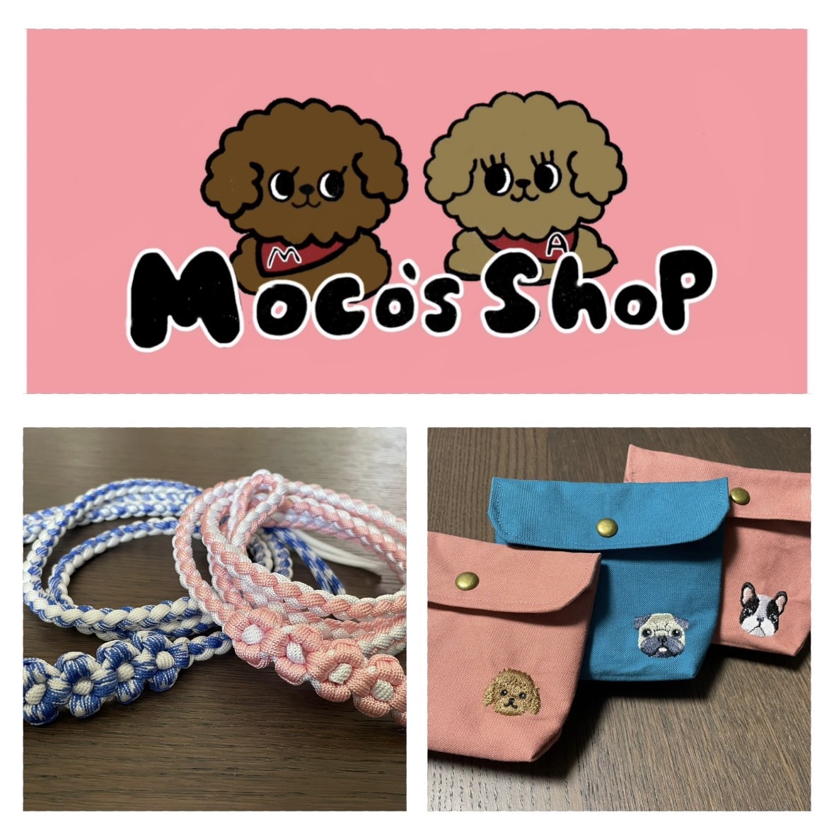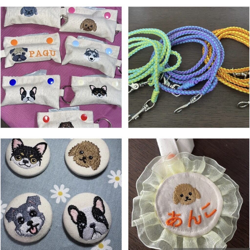 Moco’s Shop マルシェ 2025.10.29 Moco’s Shop 丈夫で便利なパラコードのショルダーリードとワンちゃんのお顔の刺繍入り小物(マナー袋ポーチやバッグなど)色々とご用意しています♪