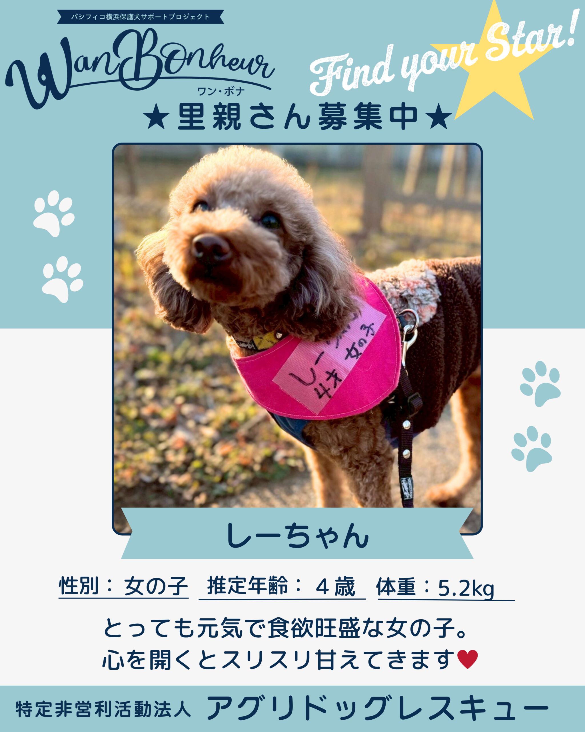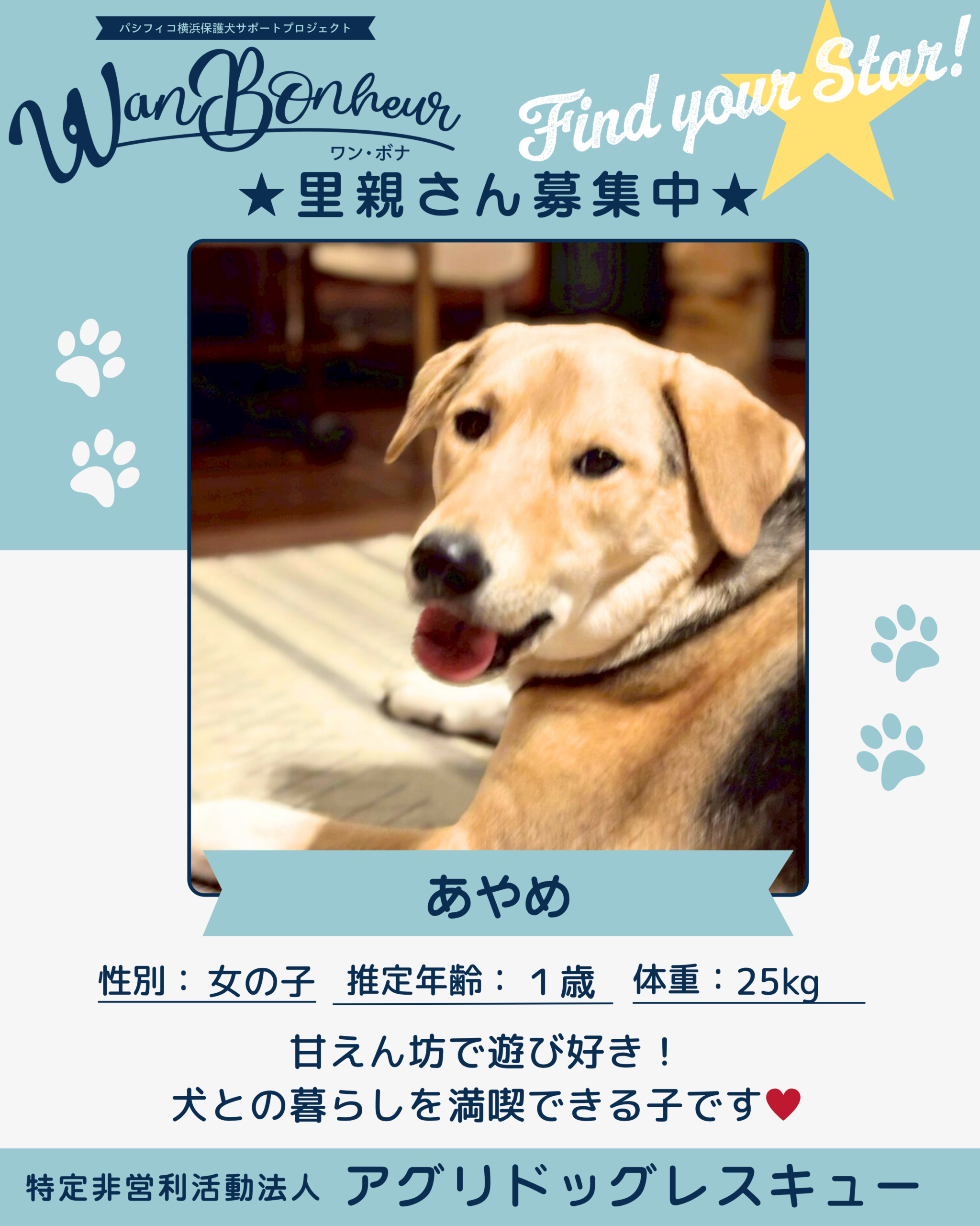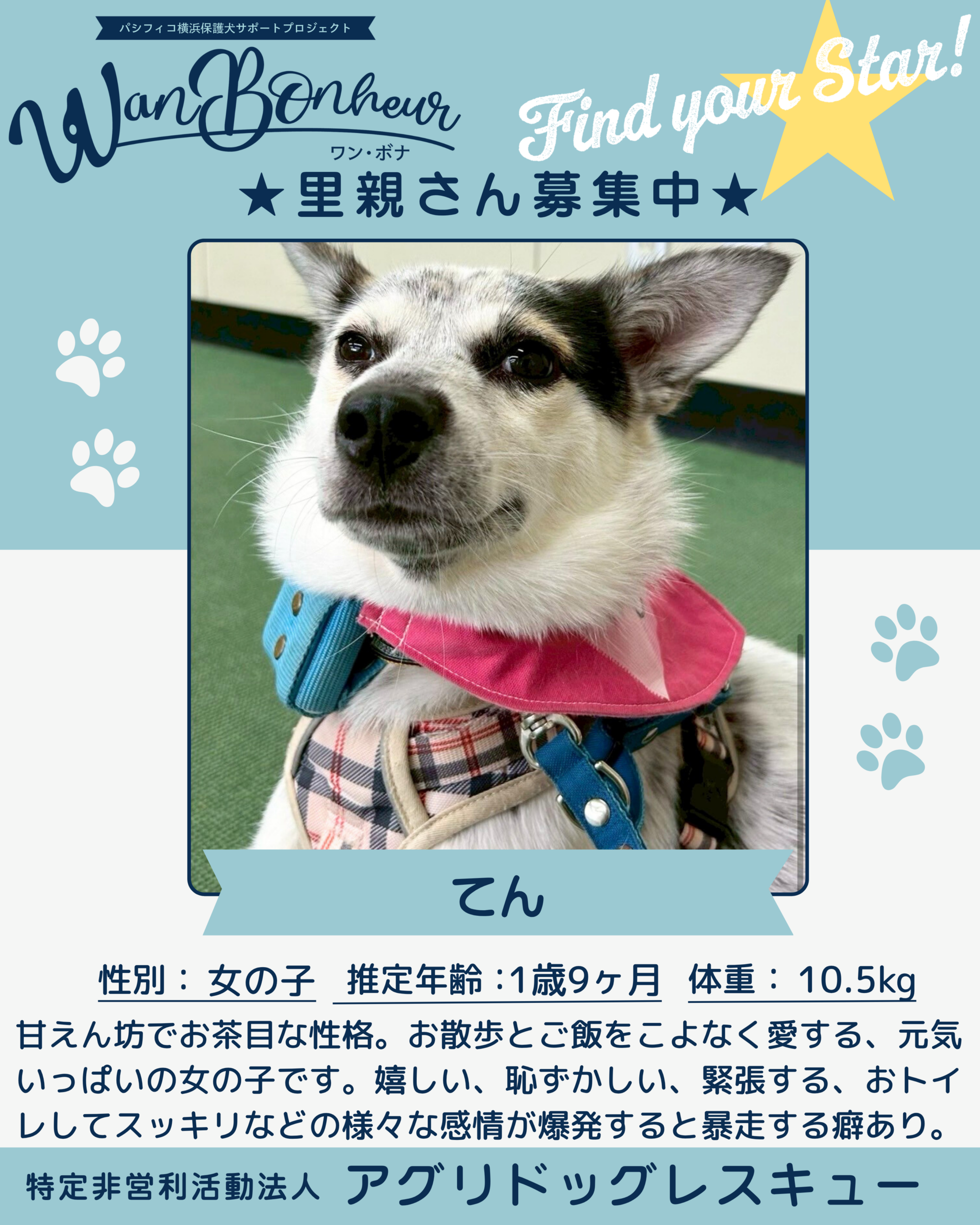2007年に設立し、2021年より特定非営利活動法人アグリドッグレスキューとして『全ての犬を笑顔に』を信念に 千葉、埼玉、東京、神奈川、茨城に活動の場を広げ 健康な子だけではなく 病気の子も高齢の子も引出し幸せに繋いでいます。