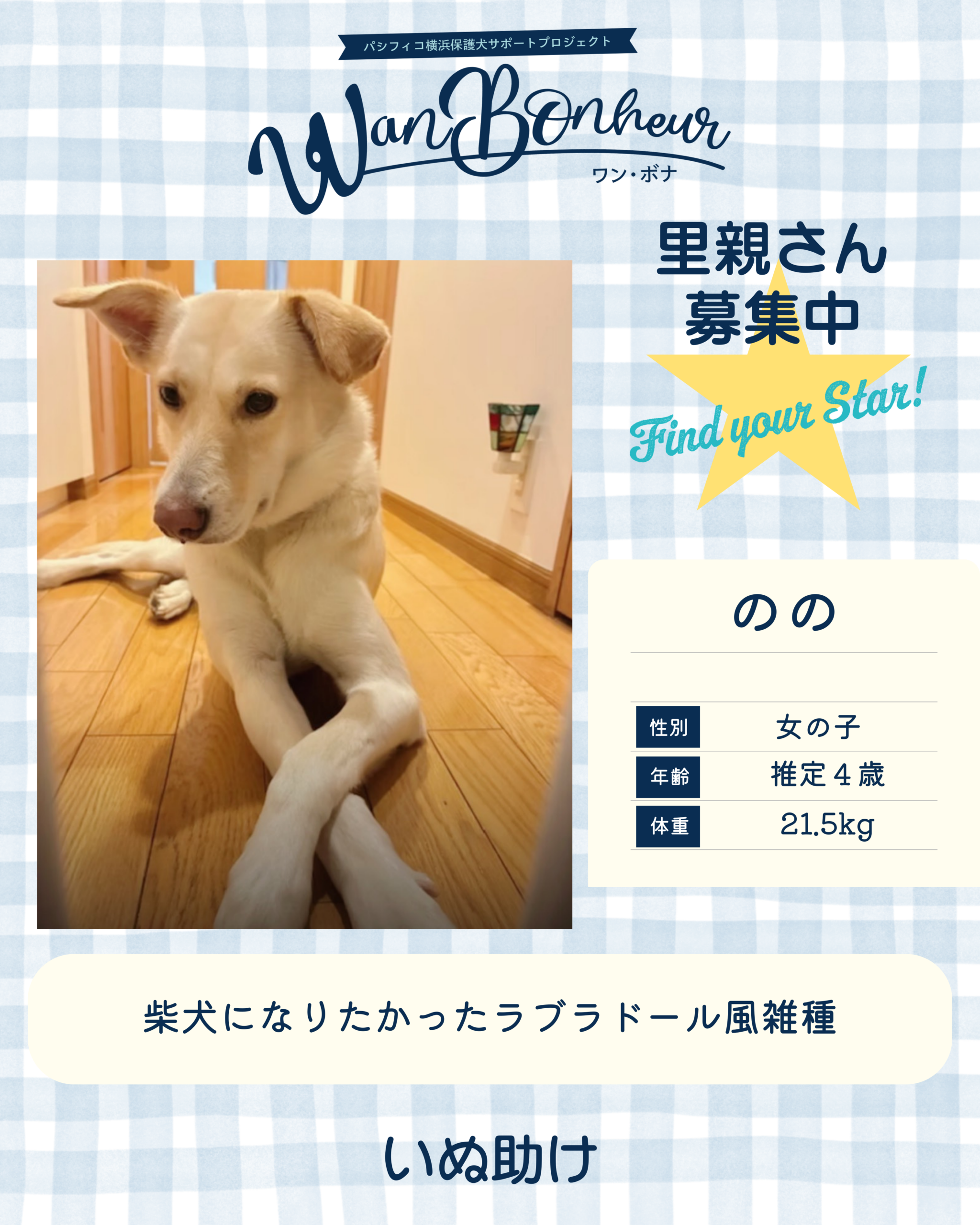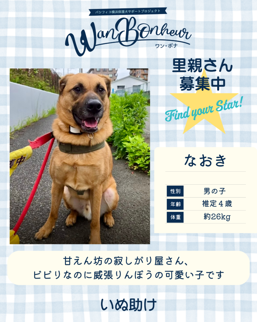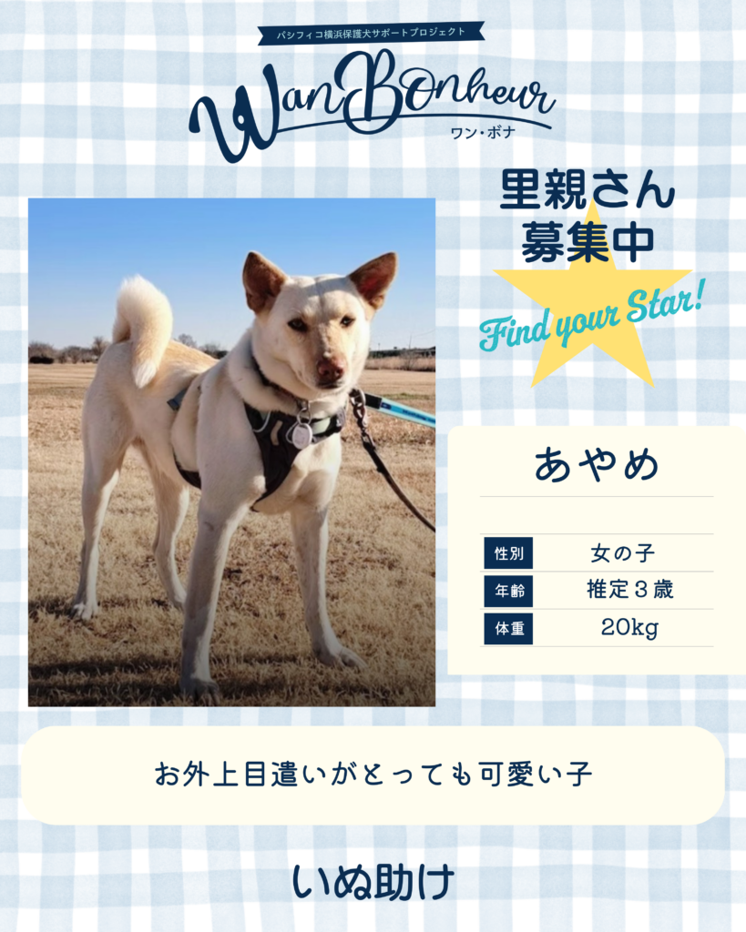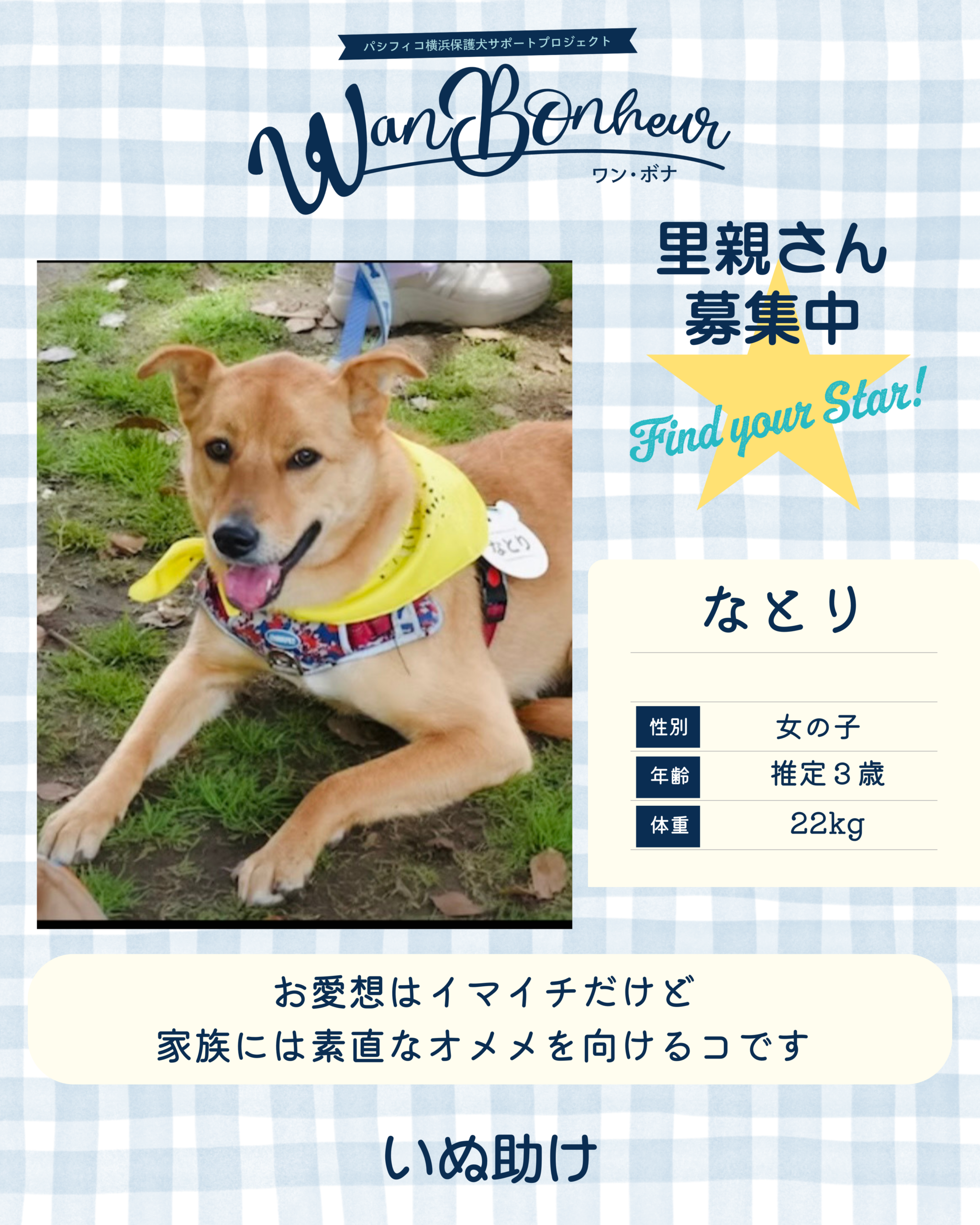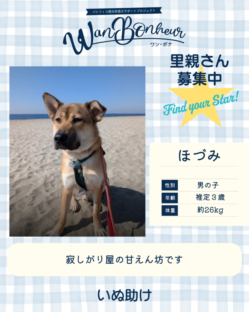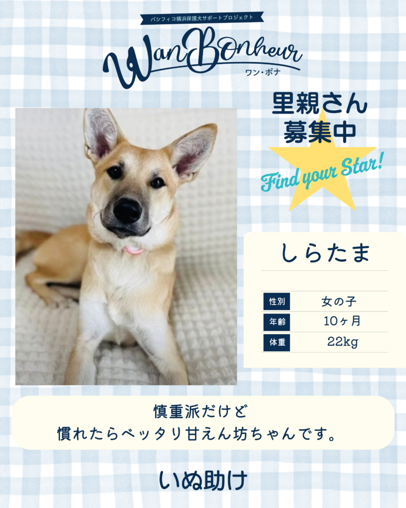 いぬ助けは、関東の動物愛護センターから中型以上の雑種犬を引き出し、預かりボランティア自宅にて心身を整えつつ新たな飼い主を探す団体です。