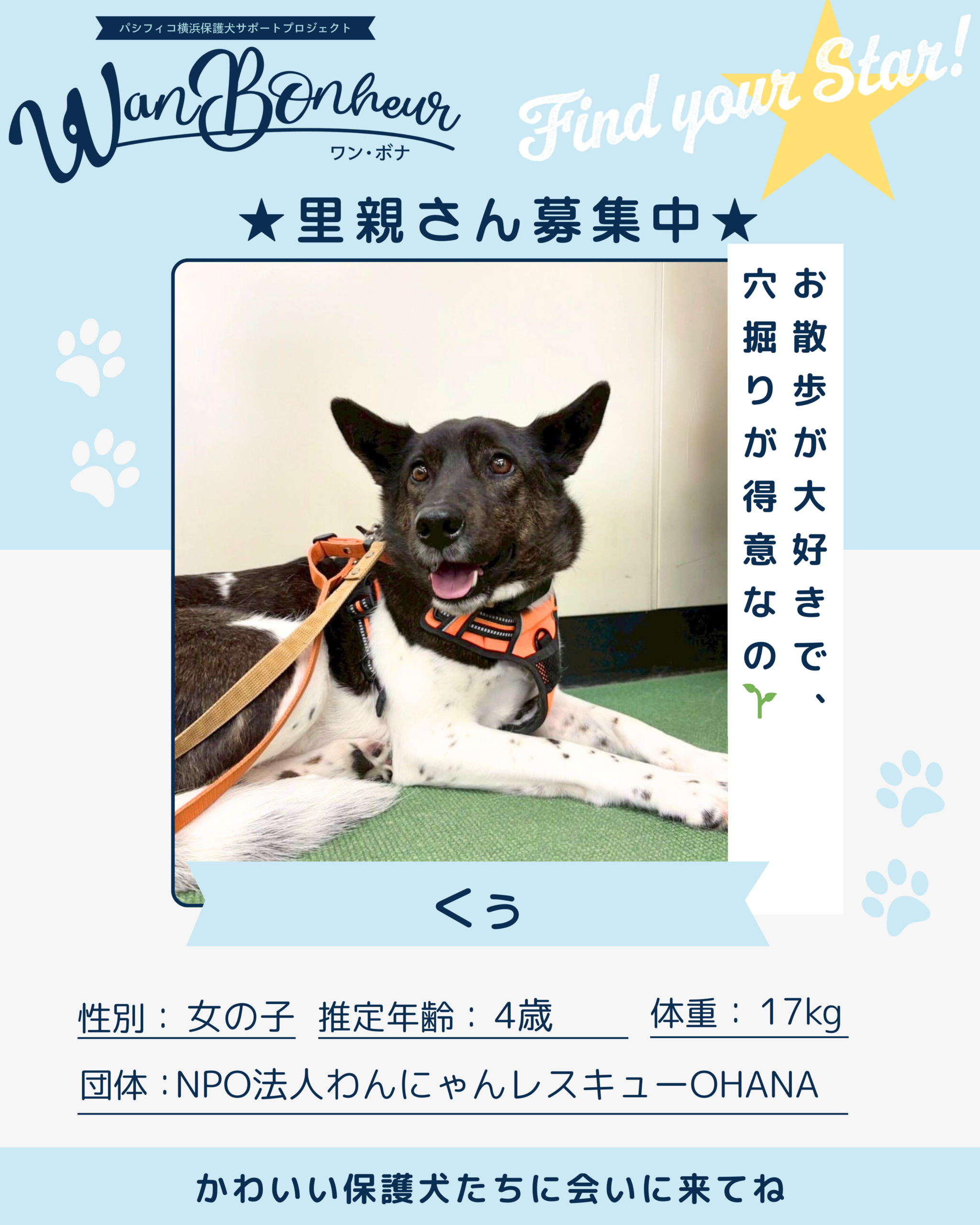 ・頂いた譲渡負担金は、OHANAで保護されている子たちの飼育費・医療費等に使わせて頂きます。 - 譲渡後半年間は月1回の写真付きメールの報告をお願いします。
